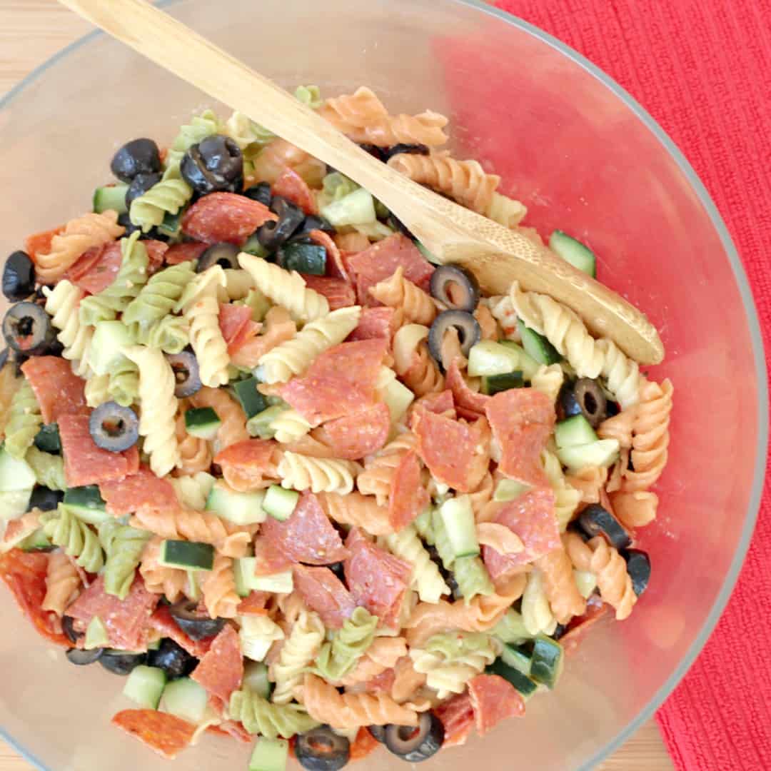 You can really make this salad your own. If you prefer chicken, then use that instead of pepperoni. If you like tomatoes, then throw in some diced tomatoes.