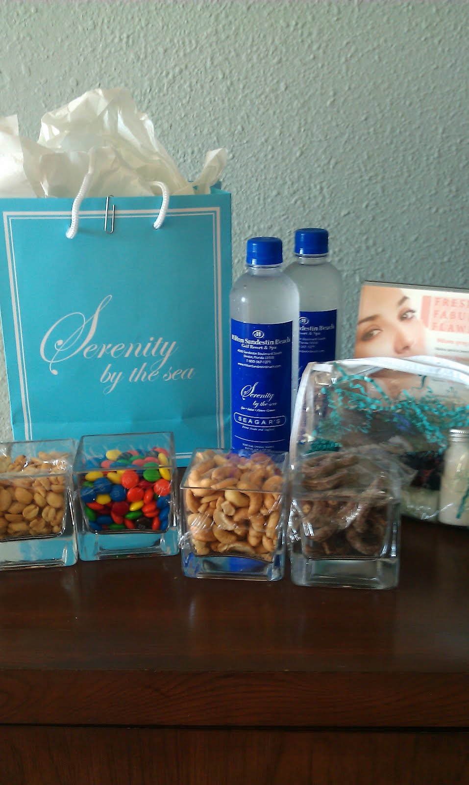 The Serenity by the Sea Spa is just another one of the fabulous features of the Hilton Sandestin. It was one of my favorite parts by far. Overall, I couldn’t ask for a better beach vacation get-away. The accommodations were spacious and clean, the beach and pools were amazing, and their was a large variety of restaurant and food choices. Another thing that made a great impression…the resort staff. Each and every single person I encountered was friendly and helpful. One afternoon, Zachary and I went on a bike ride around the Sandestin property. Upon our return, a bellboy greeted us right at the door with ice cold bottled water in hand. Another night, we returned to our suite after dinner to find a fresh plate of cookies by our bed and ice cold milk in the fridge. And, on even another occasion, the Serenity by the Sea Spa delivered a surprise to our door. Along with information regarding my spa appointment, they sent us some candy and nuts along with bottled water and some spa product samples. It’s all these little extras that added so much to our stay. Everyone went above and beyond to make our trip special.