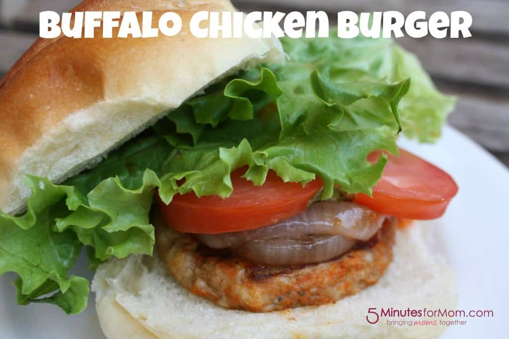 - Serve chicken burgers on rolls. Drizzle Buffalo sauce over burgers. Top with reduced fat blue cheese crumbles, lettuce, tomato, grilled onions.
