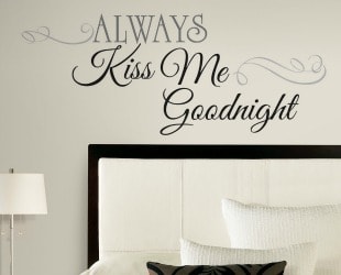 I chose Always Kiss Me Goodnight for two reasons. It is a beautiful quote and a motto that my husband and I live by. The second reason being we do not own bedroom furniture so the decal would be giving us a focus to our room and our bed since we do not have a headboard.