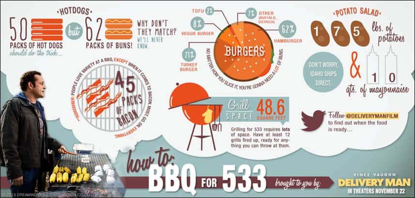 How hard is it to BBQ for a family get together? Can you imagine if there were 533 of you? Check out this fun infographic for the new Delivery Man movie on how to BBQ for 533 kids.