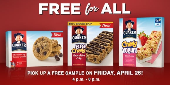 Ladies — mark your calendars for tomorrow April 26th, because the Free for All event at Kroger’s is back! Join PepsiCo and Kroger for Quaker’s Free For All Friday in-store event on April 26, from 4 to 8 p.m. local time. They will give away samples of the most flavorful PepsiCo products to hit store shelves in recent months.