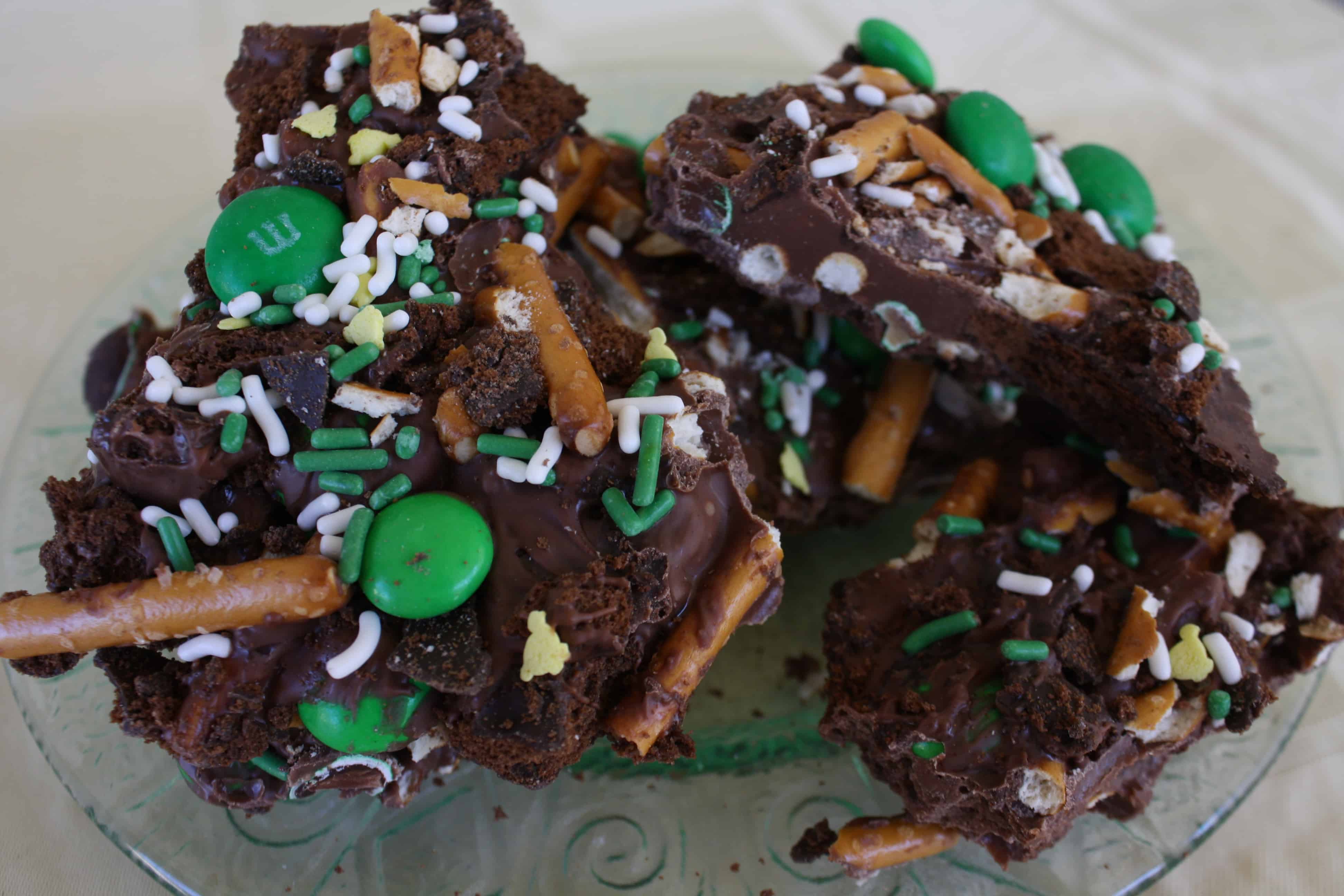 Melted milk chocolate and broken Thin Mints are the base and secret ingredient for this cookie bark. Toss in a few minty green M&Ms and a handful of plain green M&Ms for extra some chocolaty goodness. Add a few broken pretzels for a salty-sweetness and not even the trickiest leprechaun can resist.