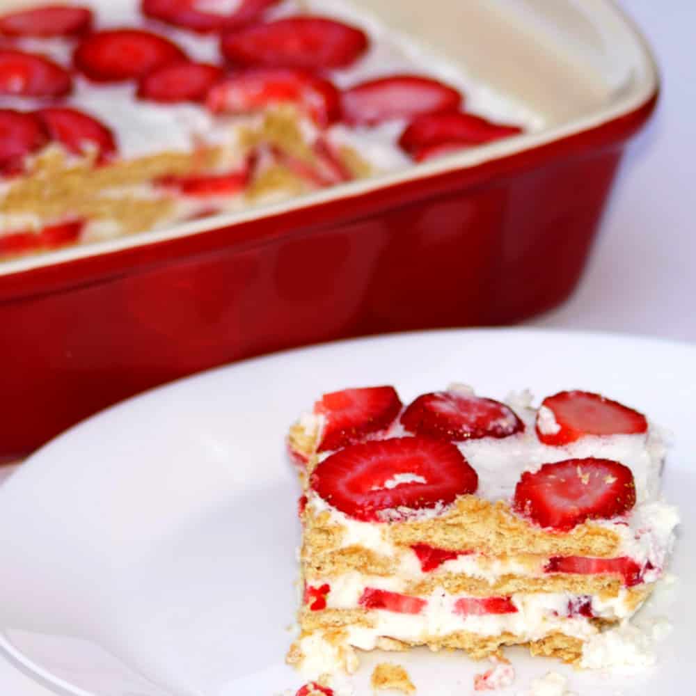 We live in Las Vegas and the summer time is brutal. We never want to turn our oven on, but we sure do love our sweets. Enjoy this Strawberry Ice Box Cake recipe.