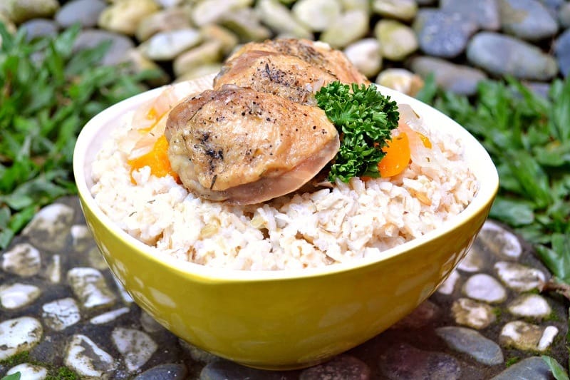 Now you’ll add more flavor so you can fully enjoy the perfect, sweet taste of this dish. Add apricots, onions and seared chicken thighs to your favorite slow cooker. Then cover and cook for 6 hours (or if you have more time, you can cook for 8 hours) on a low temperature.