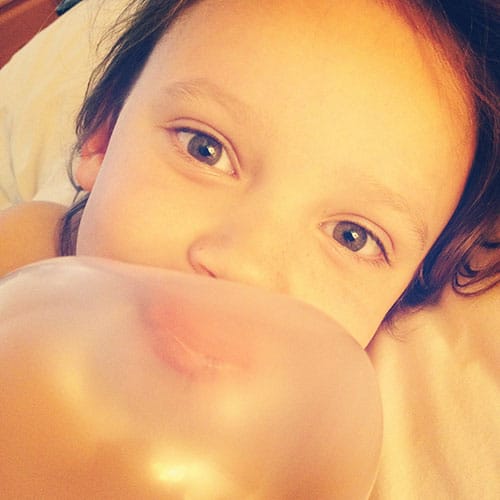 I told her to make the hole in the gum with her tongue, pull out her tongue and then blow into the hole and… ta da da! She blew her first bubble.